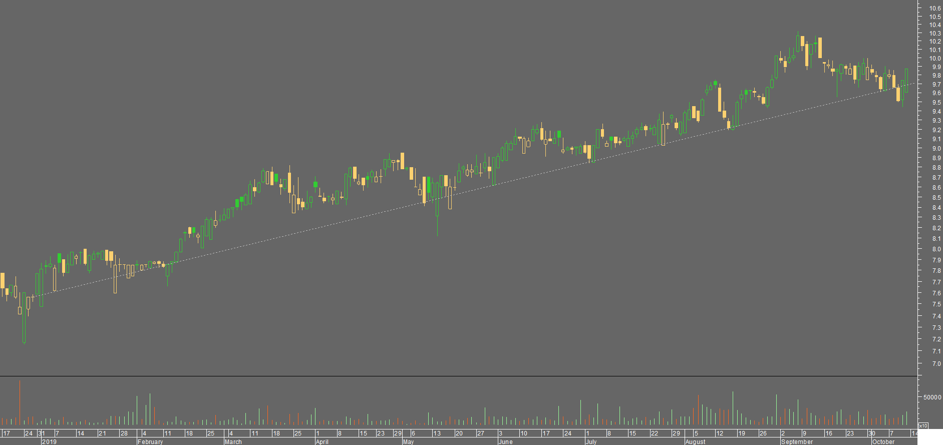 O gráfico é claro, parece-me ter caminho aberto para ir algures entre os 10,30€ e os 10,60€ fazendo novo máximo até corrigir e vir ao suporte novamente. Cotada bem estável e segura, embora nesta ultima semana e meia tenha estado muito fraca, mas lá está, estava a corrigir de máximos. Comprei a 9,80€ há 1 semana e meia e ainda veio mais abaixo, algo que nao esperava