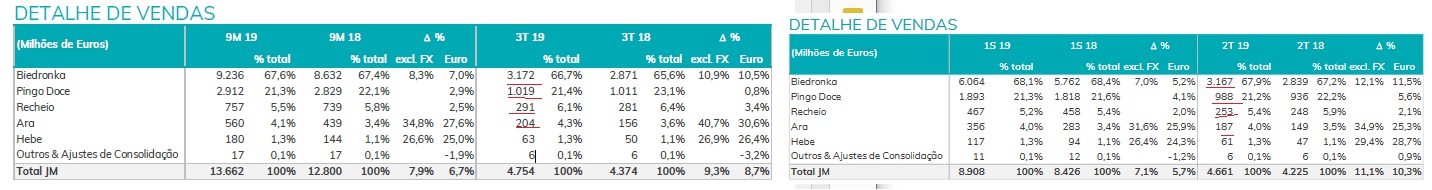 As vendas da Biedronka, a principal insígnia do grupo, nos primeiros nove meses do ano ascenderam a 9.236 milhões de euros, um crescimento de 7%. Em moeda local, as vendas aumentaram 8,3%. Ainda na Polónia, a Hebe faturou 180 milhões de euros, mais 25%.