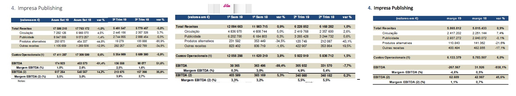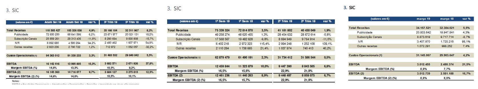 3 - Crescimento da facturação Grupo Impresa em 4% (como mais de metade do crescimento só se verificou apartir de Abril (liderança SIC 7 canais de mais de 6%, este crescimento vai-se acentuar) . Receitas consolidadas acima dos 130 milhões em 9 meses (180M em 2019