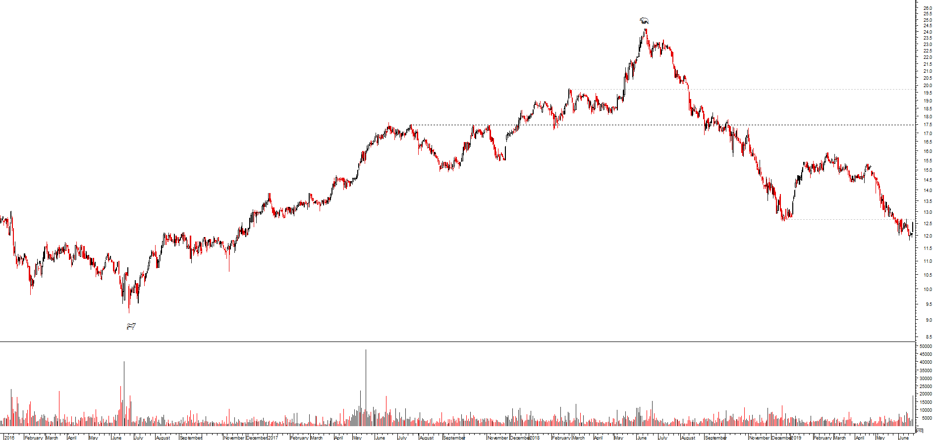 Após uma queda bem acentuada, esta cotada parece estar a consolidar na zona entre os 12,10€ e os 12,60€.