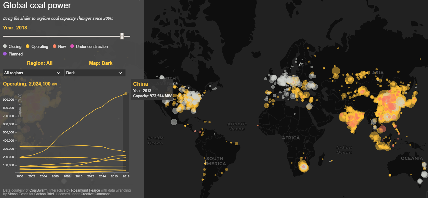 A China detém, 1.000 gigawatts (GW) metade da capacidade das centrais do mundo a carvão, seguidas pelos Estados Unidos (259 GW) e Índia (221 GW).
