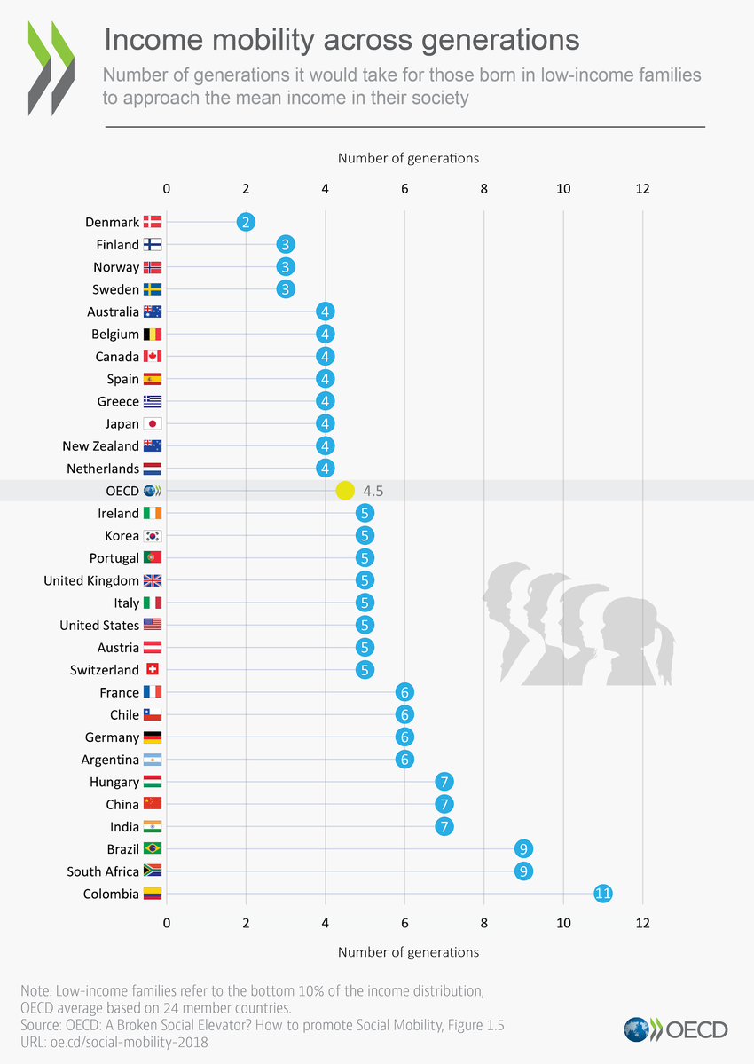 Surge assim a ideia do “Self Made Man” criado no vazio, como se não tivesse sido o Estado (ou seja, todos nós), os responsáveis pela criação das infraestruturas, das instituições e serviços que permitiram ao “Self Made Man” prosperar. Mas o mais importante, é que o Estado é dos poucos mecanismos que poderá impor um verdadeiro sistema meritocrático, ajudando a reduzir as desvantagens existentes entres os diferentes estratos sociais, para que as crianças que tiveram o azar de ser menos afortunadas nos ambientes em que nasceram, tenha menos desvantagens em comparação às crianças que nasceram em “berços de ouro”. Um estudo da OCDE mostra quantas gerações são necessárias para subir no estrato sócio-económico. E não há surpresas…países nórdicos, conhecidos pela sua menor desigualdade sócio-económica, permite uma mais rápida mobilidade social. (Ver imagem)
