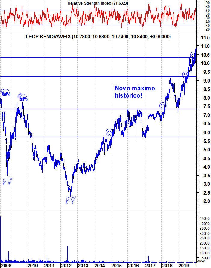 Deixo os gráficos actualizados da EDPR. Para quem duvida do poder de um "Bull Market", este é um belo exemplo. 7 anos e meio de subidas, durante o caminho muitos saíram dizendo que já tinha subido demais. Recordo uma bela discussão aqui no Caldeirão em 2018, quando a EDPR estabeleceu um novo máximo histórico e houve logo quem dissesse que era preciso cuidado, sendo que os homens da análise técnica apressaram-se a dizer que um máximo histórico é o mais poderoso sinal de força e de compra que existe.