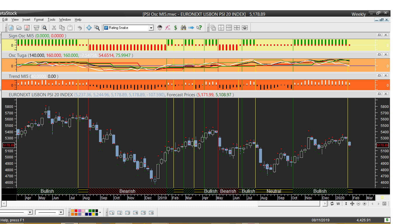 O gráfico do dia é o diário do PSI, o seu ciclo ascendente de trading diário terá ficado hoje interrompido mas a manutenção ascendente do ciclo e tendência no período semanal permitem manter o seu sinal de comprado à data atual.