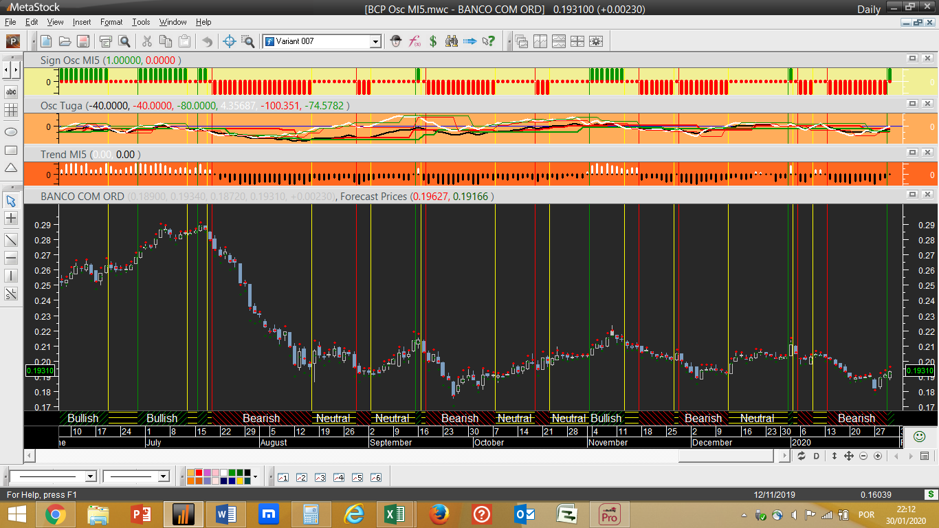 BCP – Passa de neutral a vendida. Ver gráfico abaixo, onde a tendência diária acaba de passar a negativa juntando-se à congénere semanal.