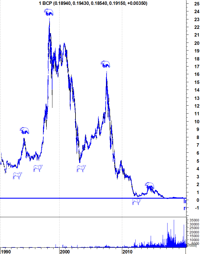 naosei, os gráficos que coloco são gráficos ajustados do aumento de capital, ou seja, dá para perceber se os investidores estão ou nao a ganhar dinheiro. Aqui fica o gráfico de longo prazo do BCP.