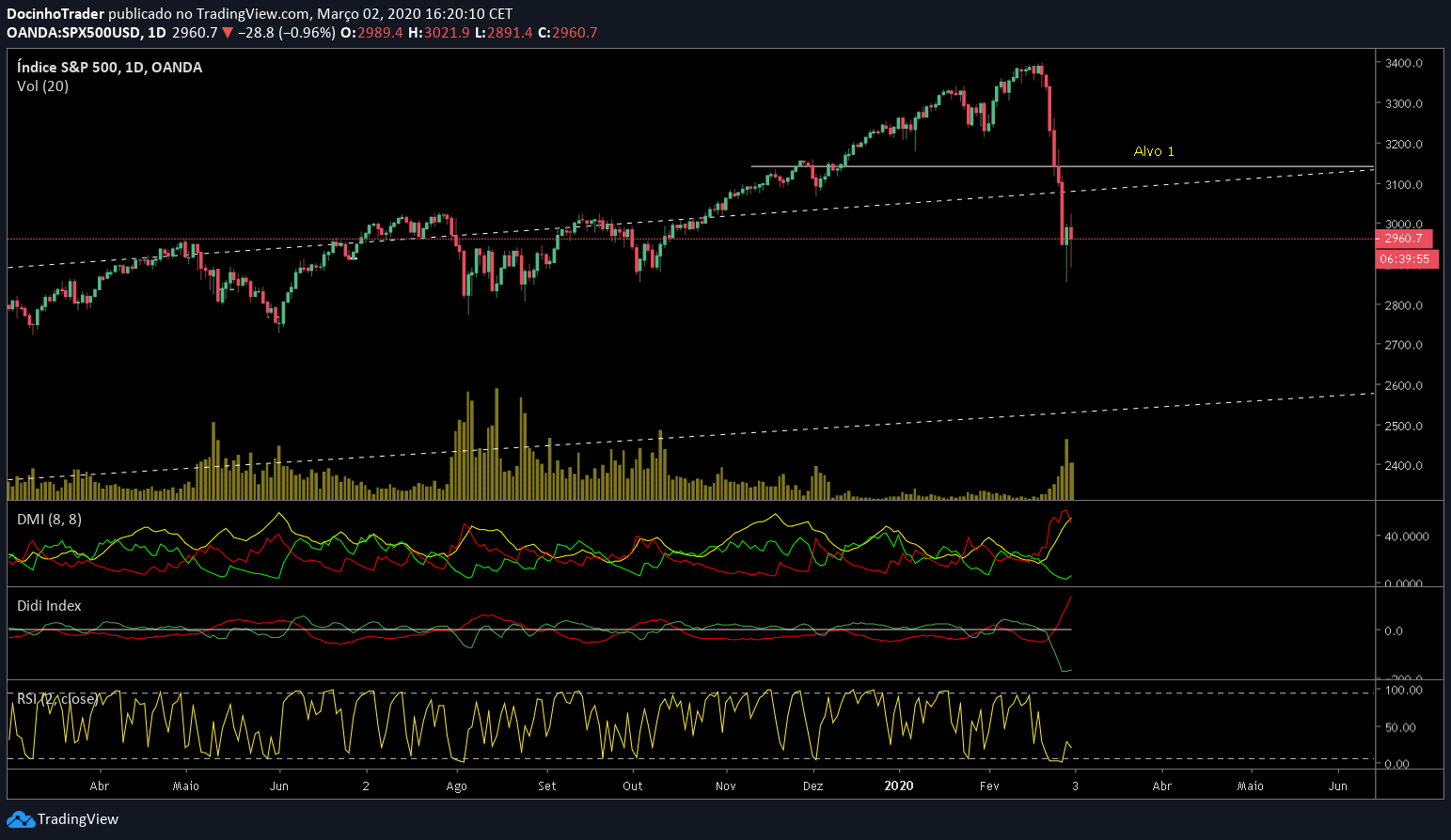 Provável estabilização do "pai de todos os índices Mundiais", o S&P500, para a sessão de hoje, 1/graças ao estado oversold, 2/às mega quedas das últimas 6 sessões, 3/à mini recessão Corona Fev/Mar já assumida por todos e 4/à quase garantida queda da taxa de juro da FED.