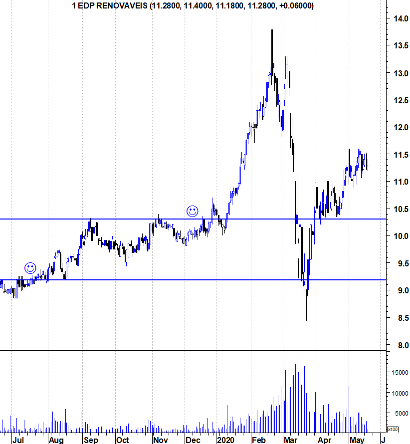 Deixo os gráficos actualizados da EDP Renováveis que tem sido uma das acções que tem mostrado mais força, à semelhança do que ocorreu nos meses anteriores à pandemia.