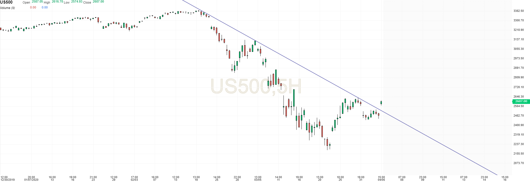 Vamos agora ver se rompe a resistência (linha) descendente e se tem um maximo em fecho acima do anterior 2630,07 para confirmar a tendência ascendente.