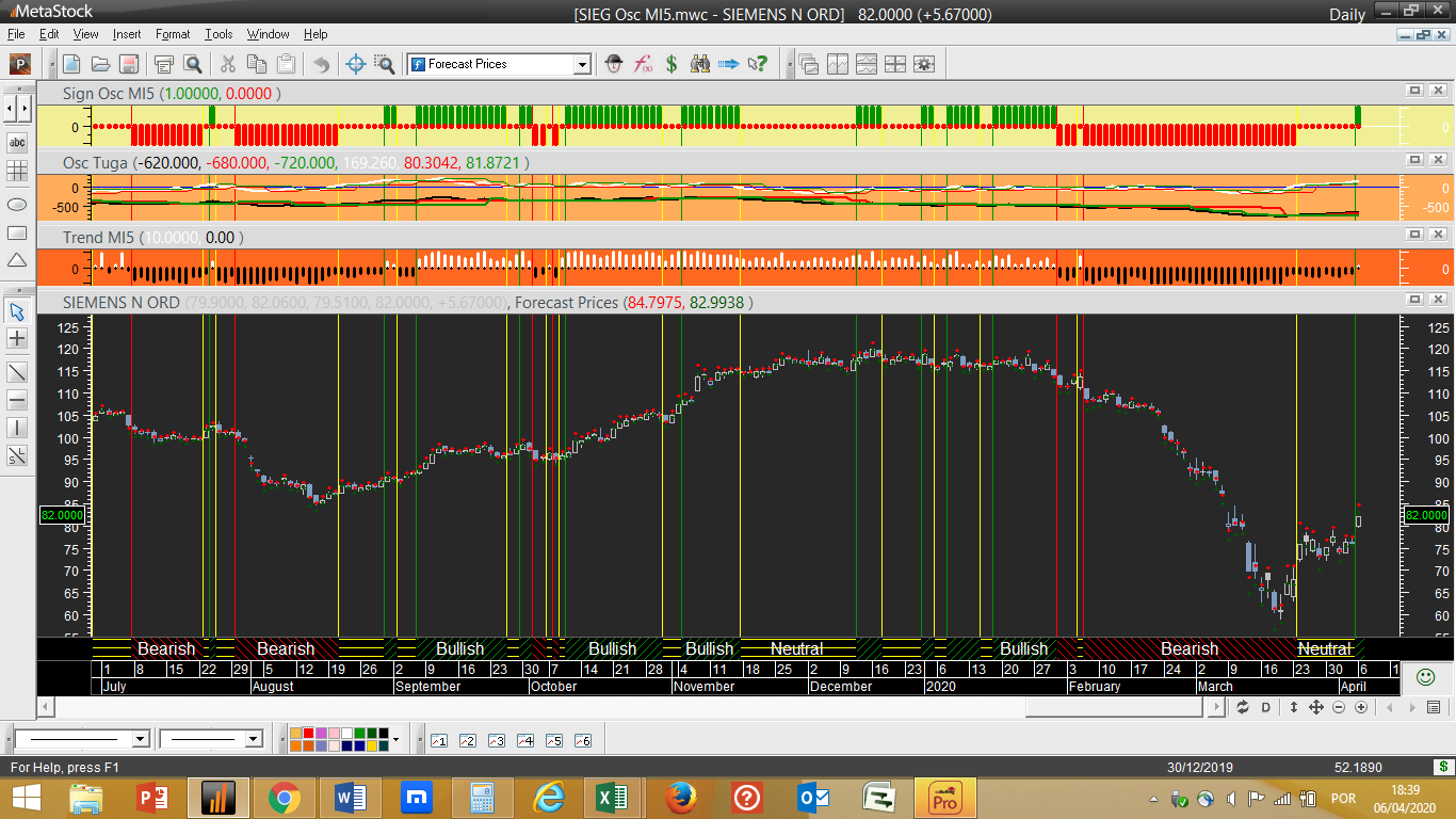 Siemens – Passa de vendida a neutral. Ver gráfico abaixo, onde na escala diária o ciclo de trading e a tendência passam finalmente ao sentido ascendente.