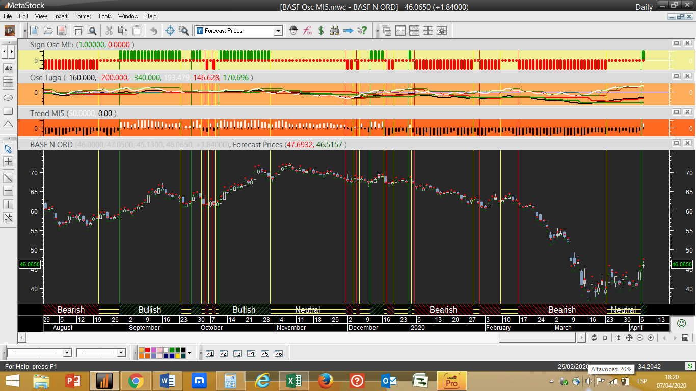 BASF – Passa de vendida a neutral. Ver gráfico abaixo com a tendência diária a dar a volta para cima a acompanhar o respectivo ciclo de trading. Na escala semanal tudo se vai mantendo para já negativo.
