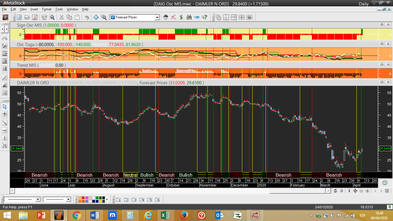Daimler – Passa de vendida a neutral. Ver gráfico abaixo com a recuperação da tendência diária, embora com um valor de força algo tímido de +10%, e do ciclo de trading para terreno positivo.