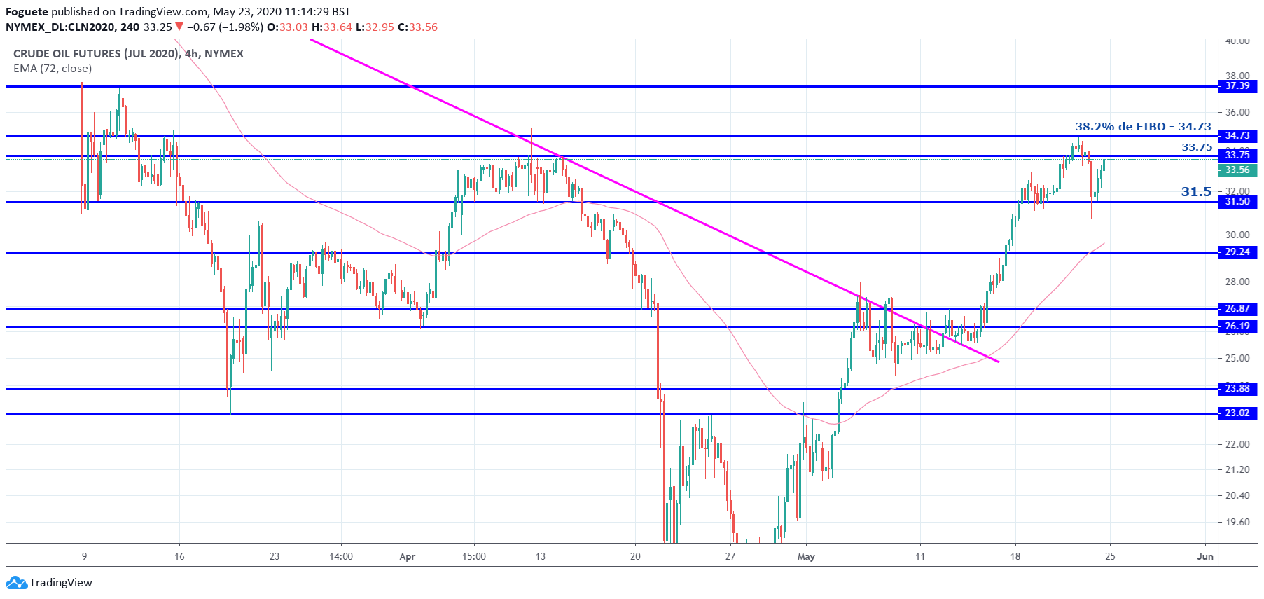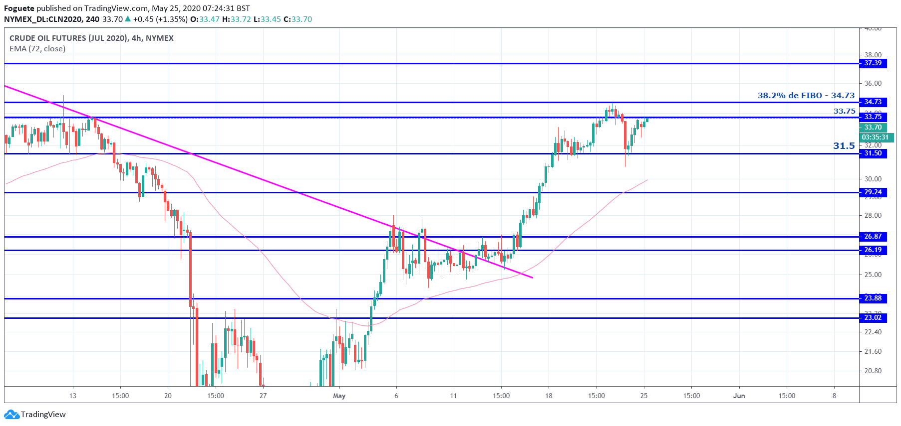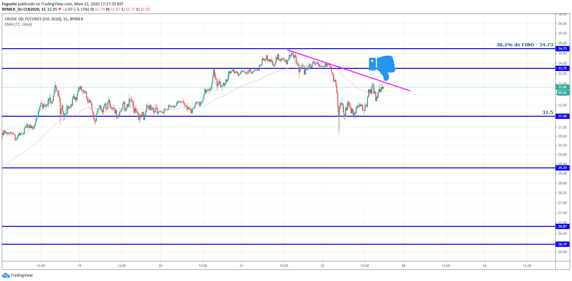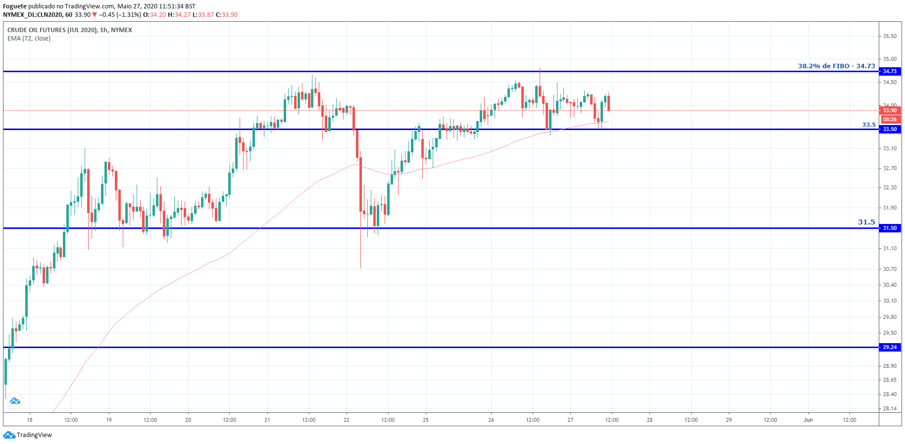 Esta zona dos 33 dólares tendo em conta que representa uma zona entre os 50%/61.8% desde os máximos 34.7 e os minimos de hoje, acho q pode ser uma boa zona de abertura de curtos
