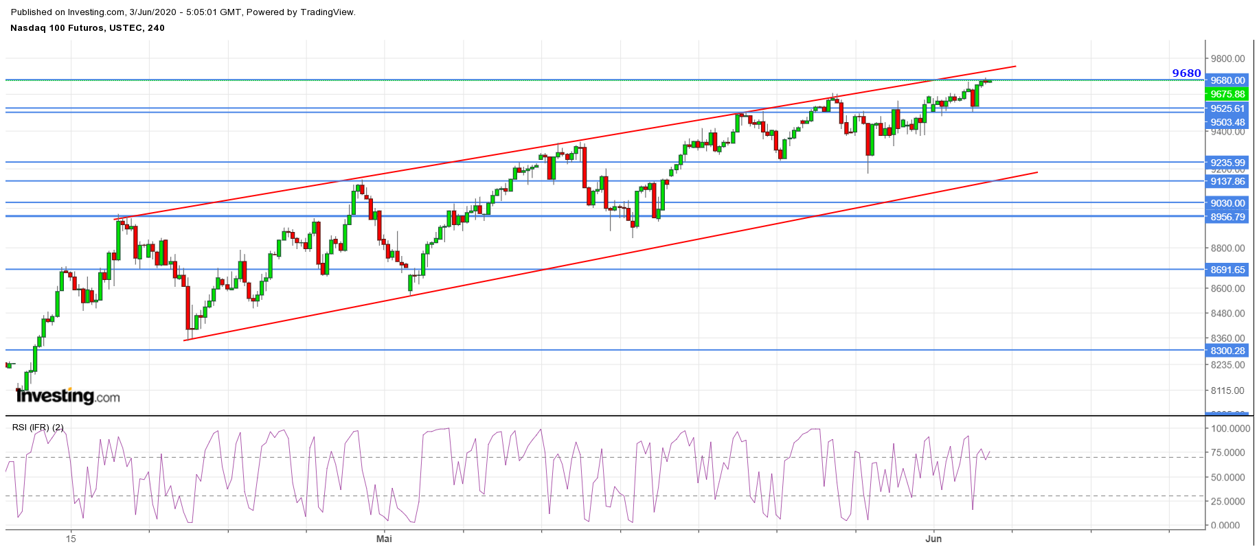Ontem qd o NASDAQ activou o IHS e logo a seguir o SP activou uma bandeira, subi os stops gains e ajustei-os relativamente perto ( 9495 e 3040) respectivamente![]()