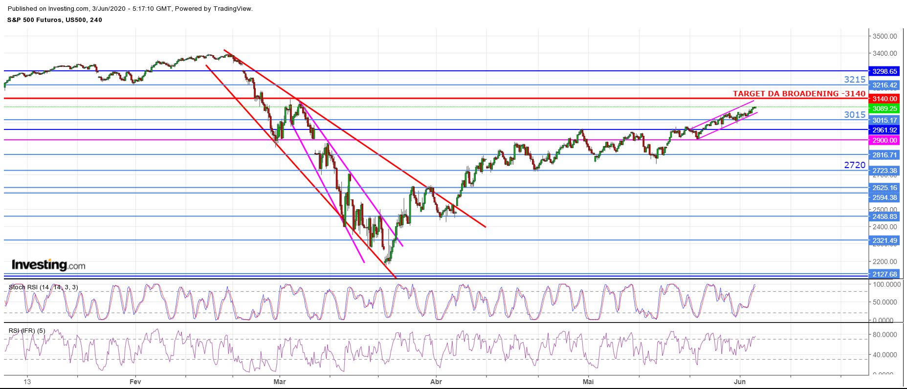 Há uns tempos atrás (quando parecia que era o dilúvio) falei numa broadening wedge descending que tinha um target nos 3130