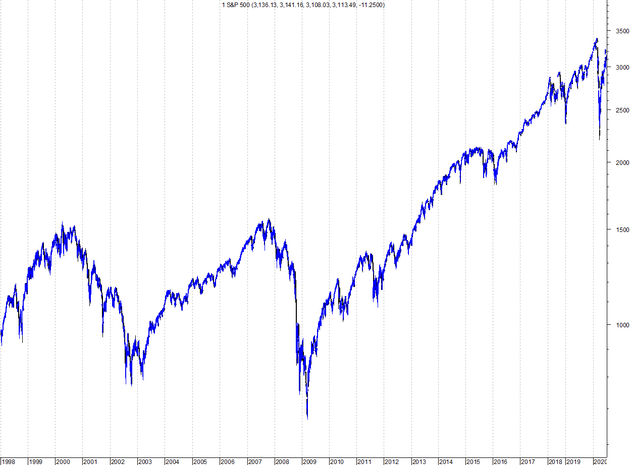 McMad e Lobus, para que possam reflectir sobre o que escreveram, deixo-vos o gráfico de longo prazo do S&P500. Coloquei em escala logarítmica para que possamos ter a real noção da variação no gráfico (se não fizesse isso, o gráfico actual seria mais a pique). Basta olhar para 2000, 2007 e comparar com agora.