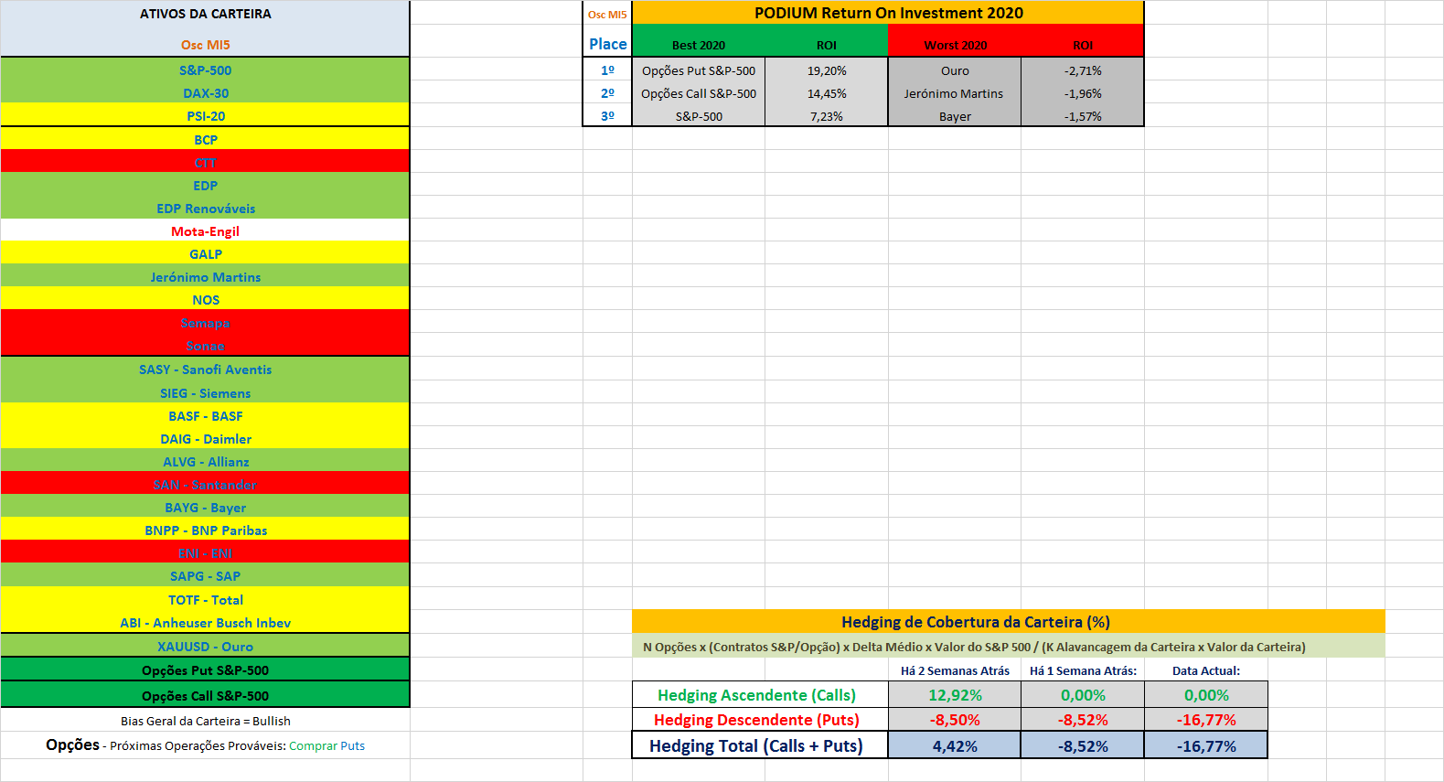 Para ser mais concreto, os Puts que hoje vieram reforçar a componente do hedging têm como data de maturidade 31 de dezembro de 2020 e correspondem ao preço de exercício de 2800 pontos do S&P-500, ou seja, cerca de 12% out-of-the-money em relação aos actuais preços de mercado. O preço de compra correspondeu a um delta de -0.23, no intervalo aconselhado para a compra de opções na estratégia da carteira de -0.20 a -0.25.