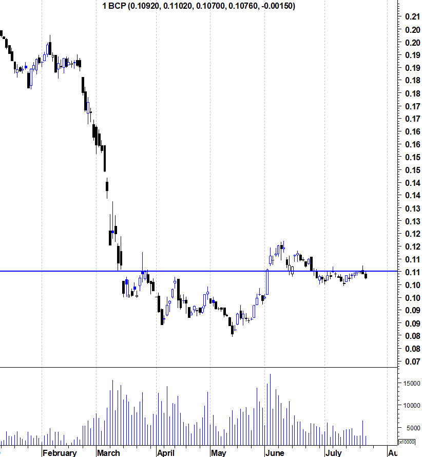 O BCP continua a procurar quebrar a resistência dos 0,11 euros. Algumas vezes, durante as sessões, tem andado acima desse valor (sobretudo ontem onde fez um máximo de 0.1124) mas não consegue quebrar a resistência em fecho. Aqui fica os gráfico actualizado.