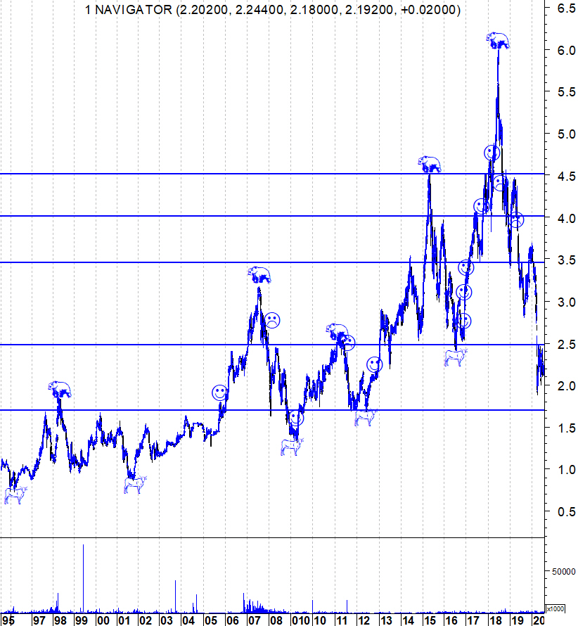 Já não actualizo os gráficos da Navigator há algum tempo, por isso, deixo aqui os gráficos actualizados deste "Bear Market" que já tem 2 anos e que a pandemia agravou. A que devemos estar atentos? A um sinal de força que ainda não ocorreu. Esse primeiro sinal seria a quebra da zona de resistência entre os 2,42 e os 2,48 que foi aquela que travou os ressaltos da acção nos últimos meses.