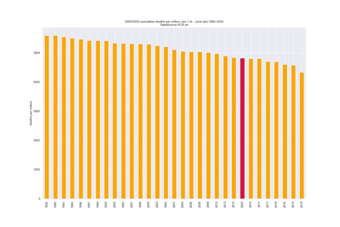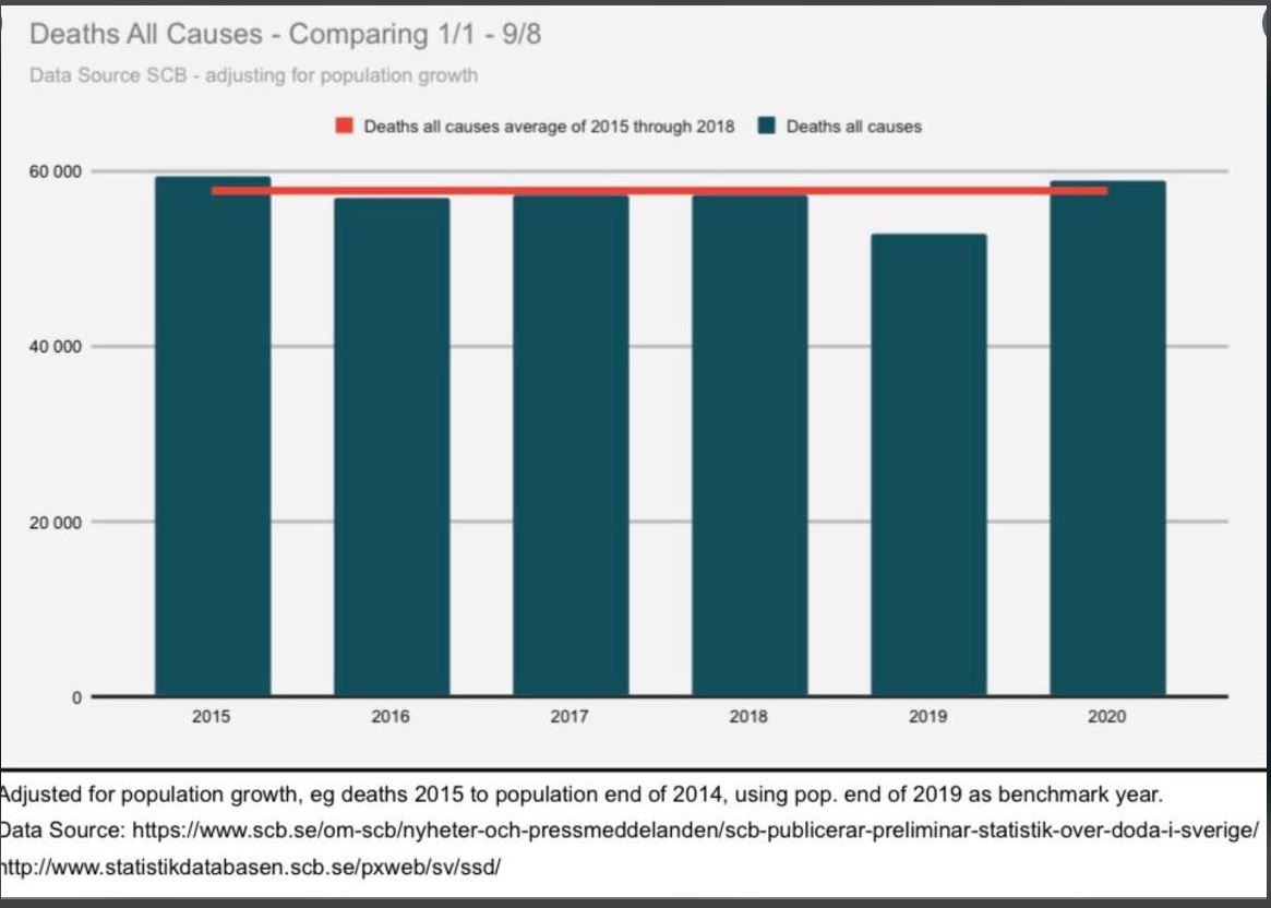 "...No total, 51.405 suecos morreram no período de Janeiro a Junho, um número superior ao de qualquer ano desde 1869, quando 55.431 morreram, na altura em parte por culpa de uma crise de fome. A população da Suécia era então de cerca de 4,1 milhões, em comparação com os actuais 10,3 milhões.