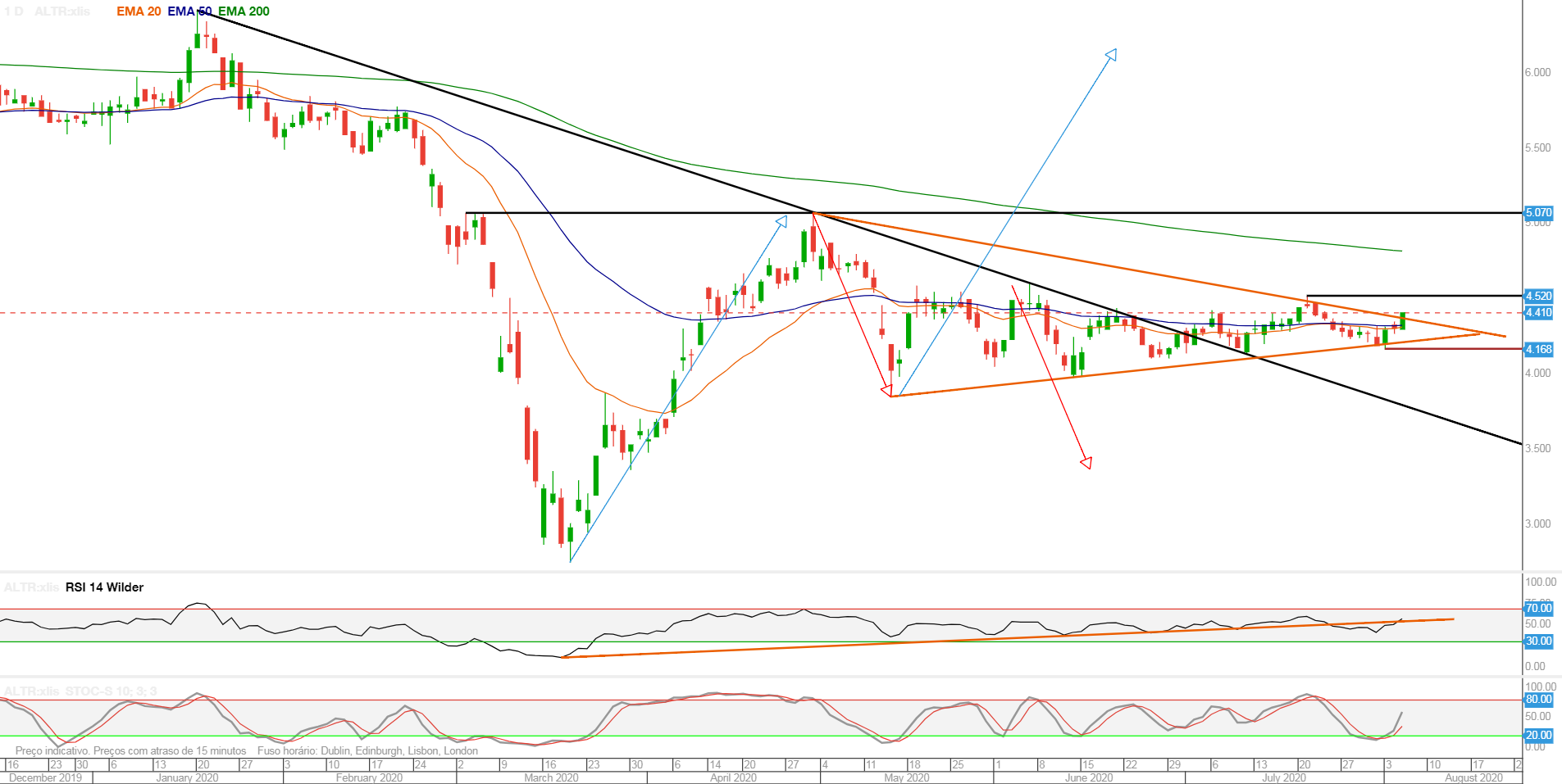 Parece-me altura de entrar em compras na ALTRI, hoje não fez novo mínimo e fez novo máximo em relação ao dia de negociação anterior.