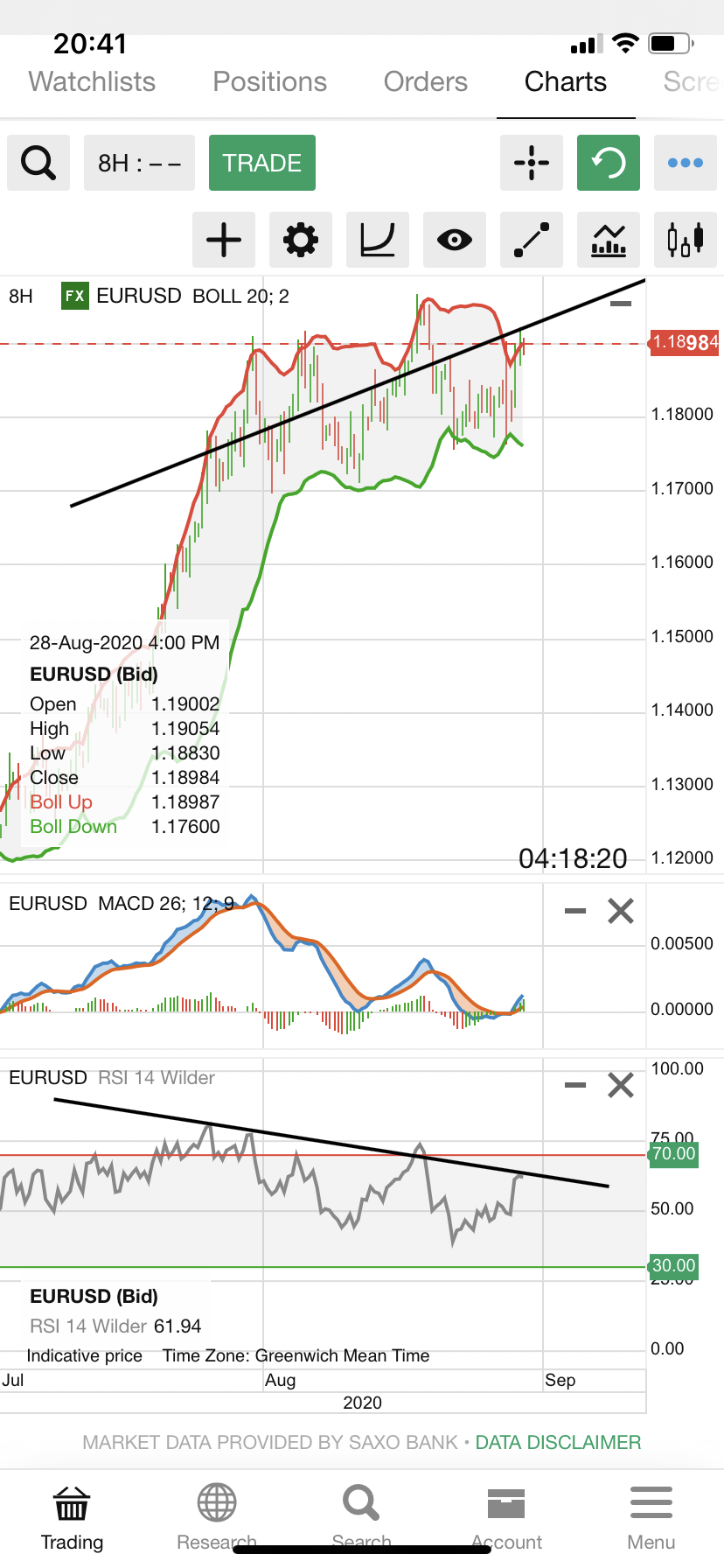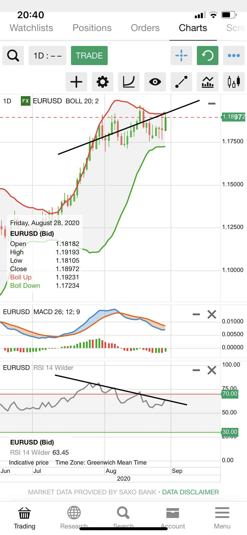 Eu agora mando um do EUR/USD mesmo, diário, onde se vê a possibilidade de quebra de tendência, a qual só se confirmará se o par quebrar o suporte, que está relativamente perto...