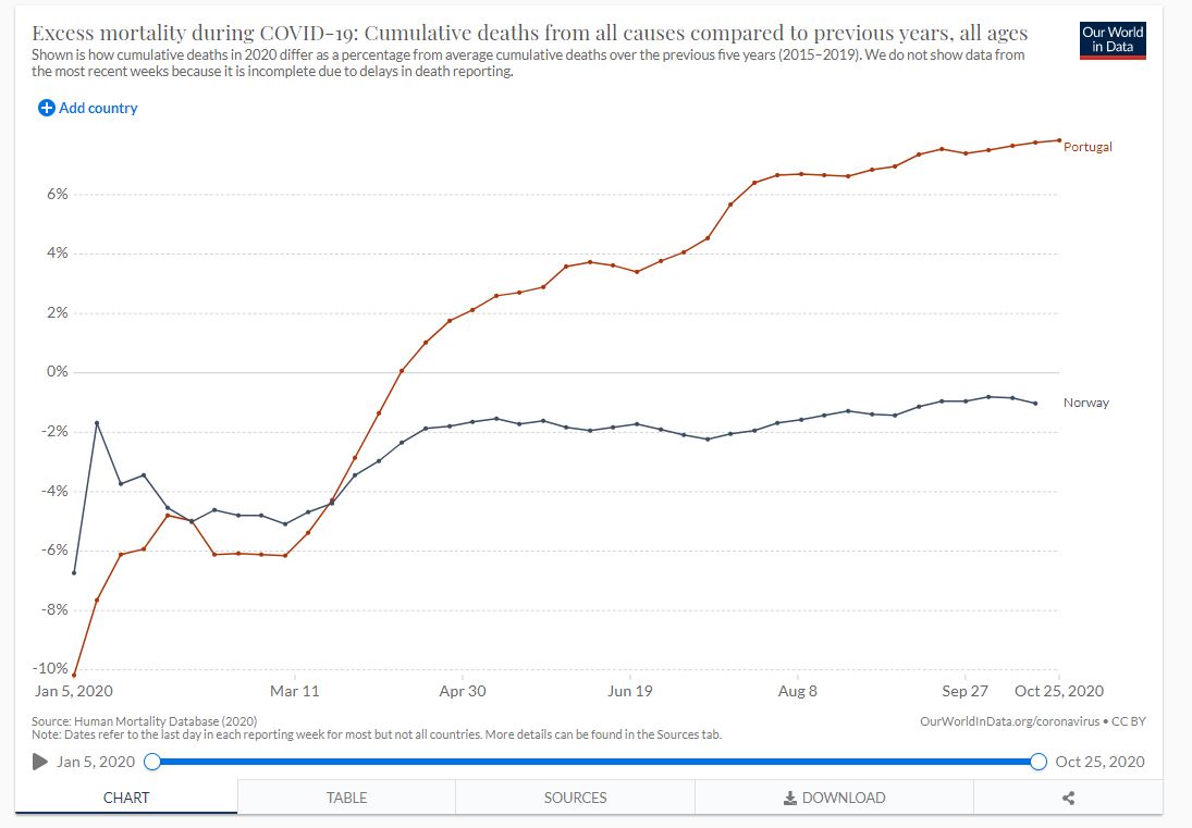 BearManBull Escreveu:Tanto que a abordagem do confinamento de Março atè Julho nos tem agora com a realidade de 3700 mortos só de covid fora o excesso de mortalidade não covid.