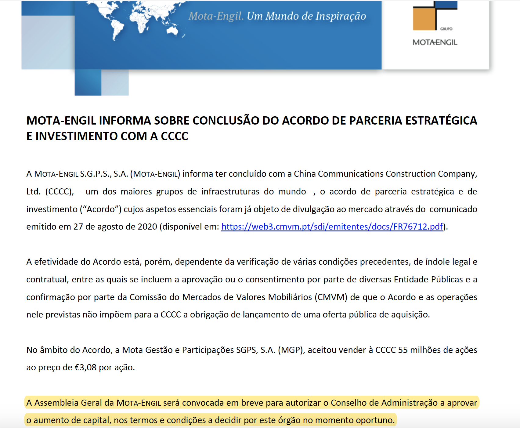 vieirah1976 Escreveu:Numas noticias vejo que a compra foi feita ao accionista maioritário, noutras notícias vejo que vai haver aumento de capital para entrada da CCCC.