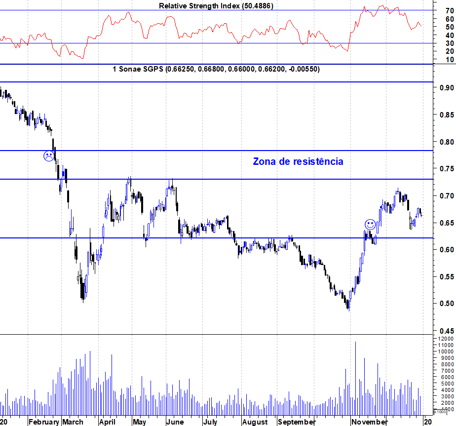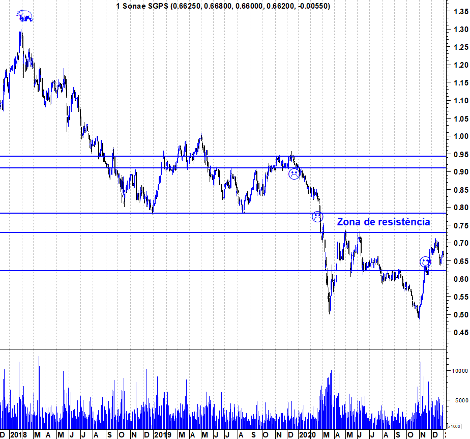 Não é a acção com mais peso do PSI, mas normalmente é a mais importante como barómetro da Bolsa portuguesa. E, na verdade, a situação técnica da Sonae reflecte um pouco o actual momento do nosso mercado. A Sonae deu ali um sinal de força com a quebra da resistência dos 0,62 euros. As próximas semanas vão ser interessantes pois, se por um lado, é importante que continue a manter-se acima desse novo suporte dos 0,62, por outro lado seria um enorme sinal quebrar a zona de resistência entre os 0,74 e os 0,78 euros.