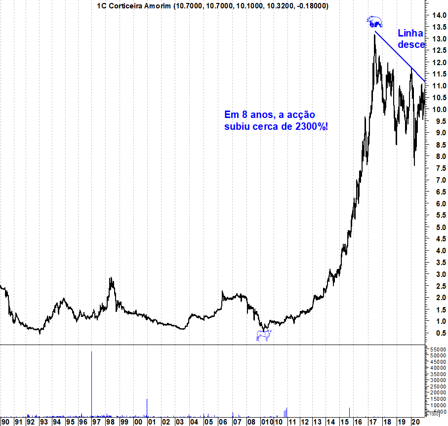Aquilo que quero acrescentar neste tópico é o gráfico de longo prazo da Corticeira. Na verdade, olhando para a correcção dos últimos anos, é apenas um movimento normal depois de um crescimento absolutamente inacreditável da acção que multiplicou por mais de 24 o seu valor em Bolsa em 8 anos. Sim, é uma acção da Bolsa portuguesa.