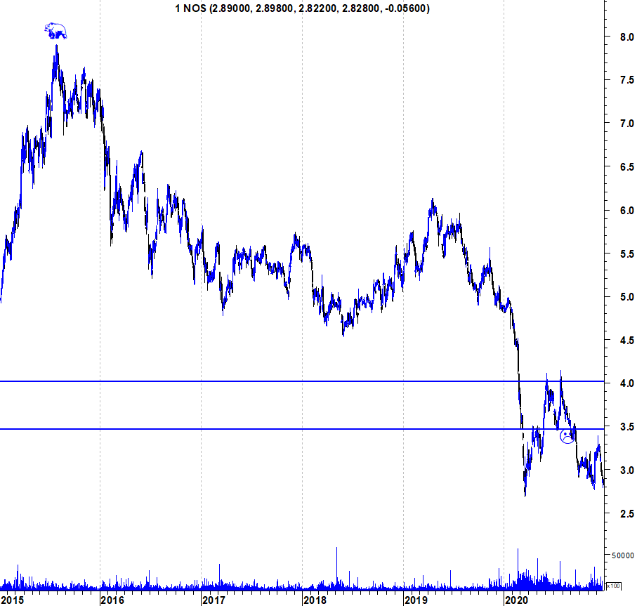 Deixo os gráficos actualizados da Nos, junto ao suporte mas que mantém a tendência descendente em todos os horizontes temporais.