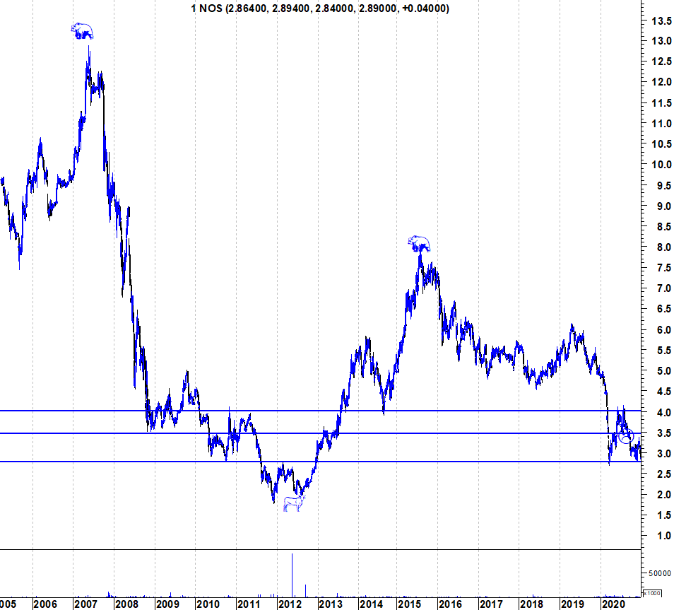 Ulisses, peguei no teu grafico de muito longo prazo (desculpa a copia, mas não tenho acesso a dados tão antigos) e creio que podemos dizer que existe um suporte referência junto ao valor atual (2.7) que pode ser referência (a preto). Apesar de ser de muito longo prazo, acho que pode ter alguma relevância, mais com o RSI a entrar em zona de oversold.