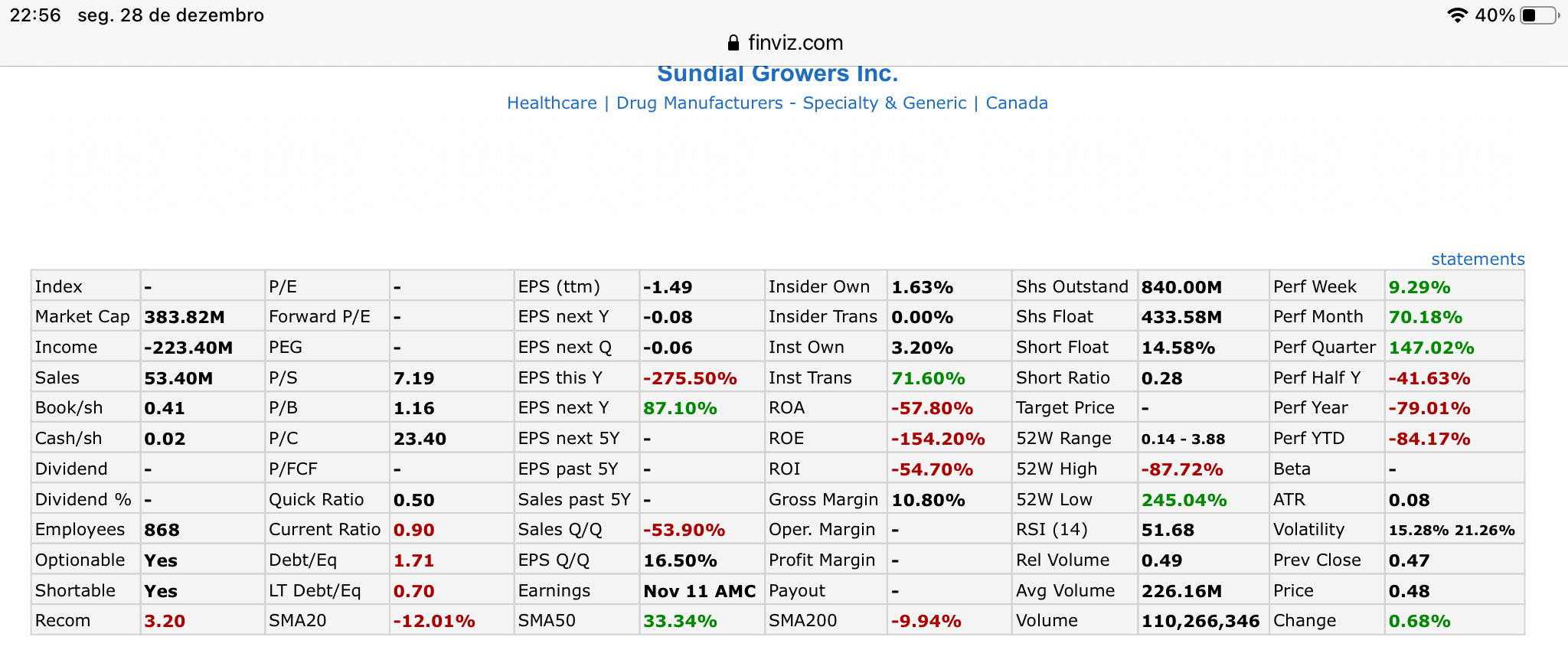 Com o ShortFlow que existe na Sundial (cerca de 14%) é dificil validar se tem pernas para recuperar. Tlavez um short squeez com alguma noticia importante envolvida possa ser um verdadeiro momento de alegria.