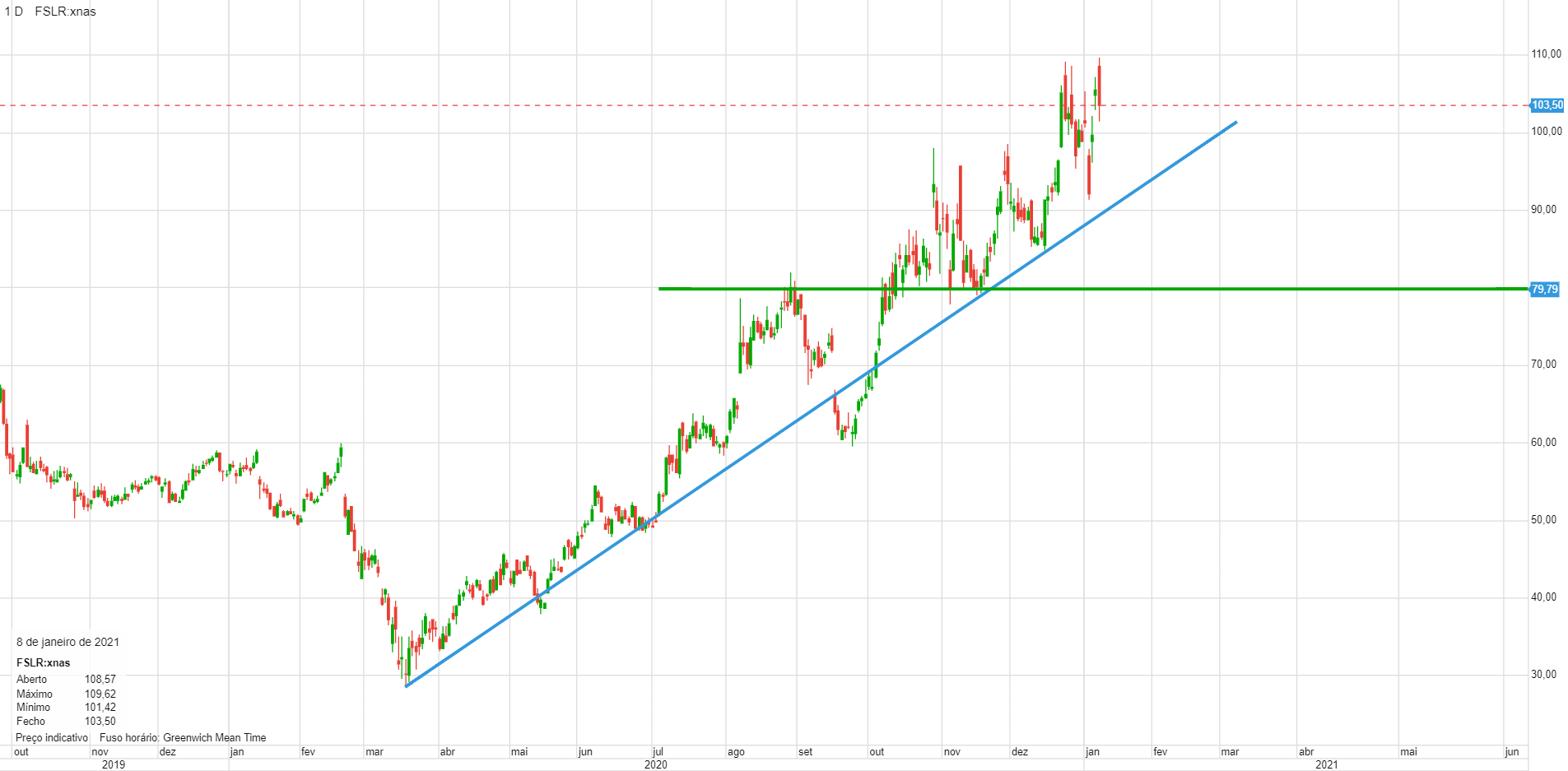 No gráfico semanal é possível ver a subida consistente desde 2017. No curto prazo fez depois da correção de Março, um canal ascendente relativamente bem definido. Tem um importante suporte na zona dos 72$, pelo que permite uma entrada com um stop relativamente curto.