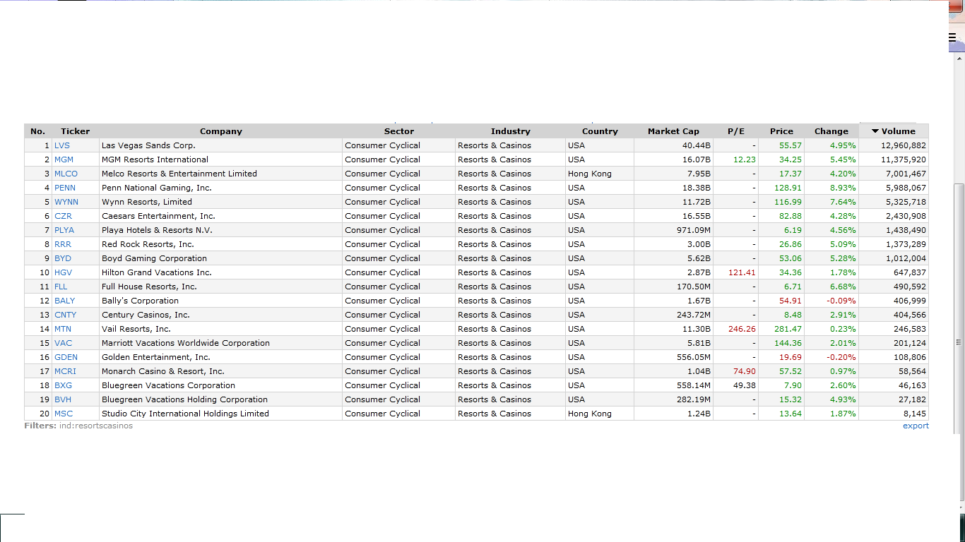 Uma ou outra cotada da lista que partilhas, constam como pertencentes ao setor dos Casinos & Resorts. Acho que existe alguma relação entre estes dois setores e o dos Casinos & Resorts tem nos últimos dias registado valorizações interessantes. O pessoal que gosta de casinos, anseia pelo fim da pandemia para os poder frequentar