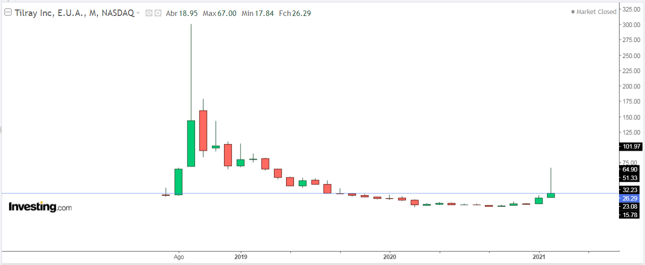 Deixo por exemplo o grá´fico mensal da Tilray.