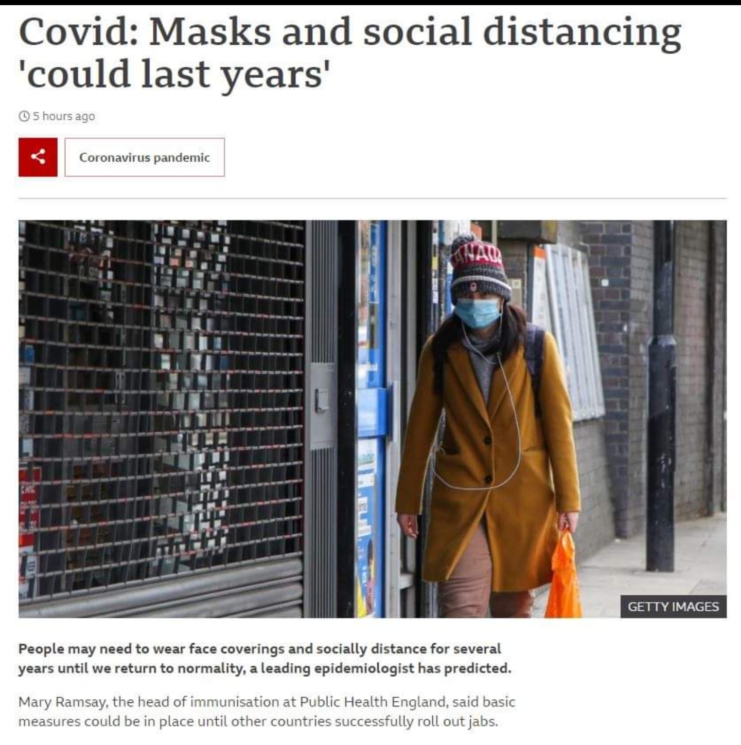 A responsavel pelo programa de vacinação de Inglaterra ja veio avisar que mesmo com vacinacao da populacao o distanciamento social e as mascaras serão para manter durante anos.