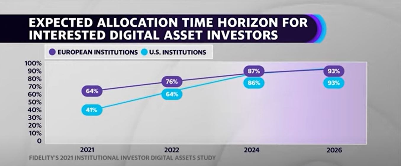 A adoção ainda tem um longo caminho a percorrer, apesar da aceleração espetacular dos últimos anos, muito mais rápida que, por exemplo, a da internet. O que se vai sentir mais não será tanto a adoção entre 0 e 1, mas sim a dimensão da exposição. P. ex uma folgada maioria de investidores institucionais já está presente no espaço crypto e a quase totalidade prevê estar presente em menos de 5 anos.