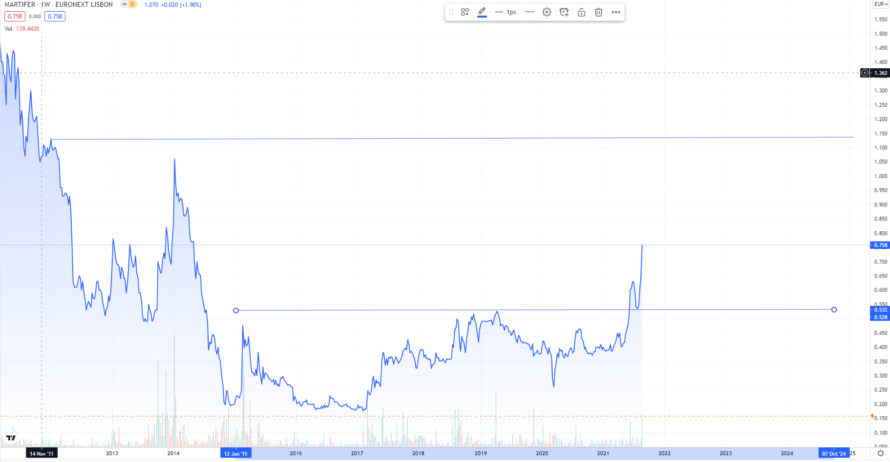 Fiquei surpreendido pelo facto de esta ação ter-me passado por baixo do radar. São 350% de valorização desde mínimos pandémicos de há 17 meses (Março de 2020 » de 0,215€ aos 0,76€ atuais), corporizando a 2ª melhor valorização do PSI nesse período (a seguir à EDPR).