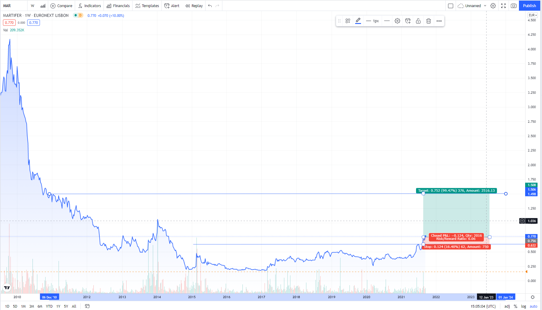 Vamos lá ver como corre , risk reward ratio de 6, potencial de valorização de 100%, stop no anterior topo com potencial de queda de 16%.