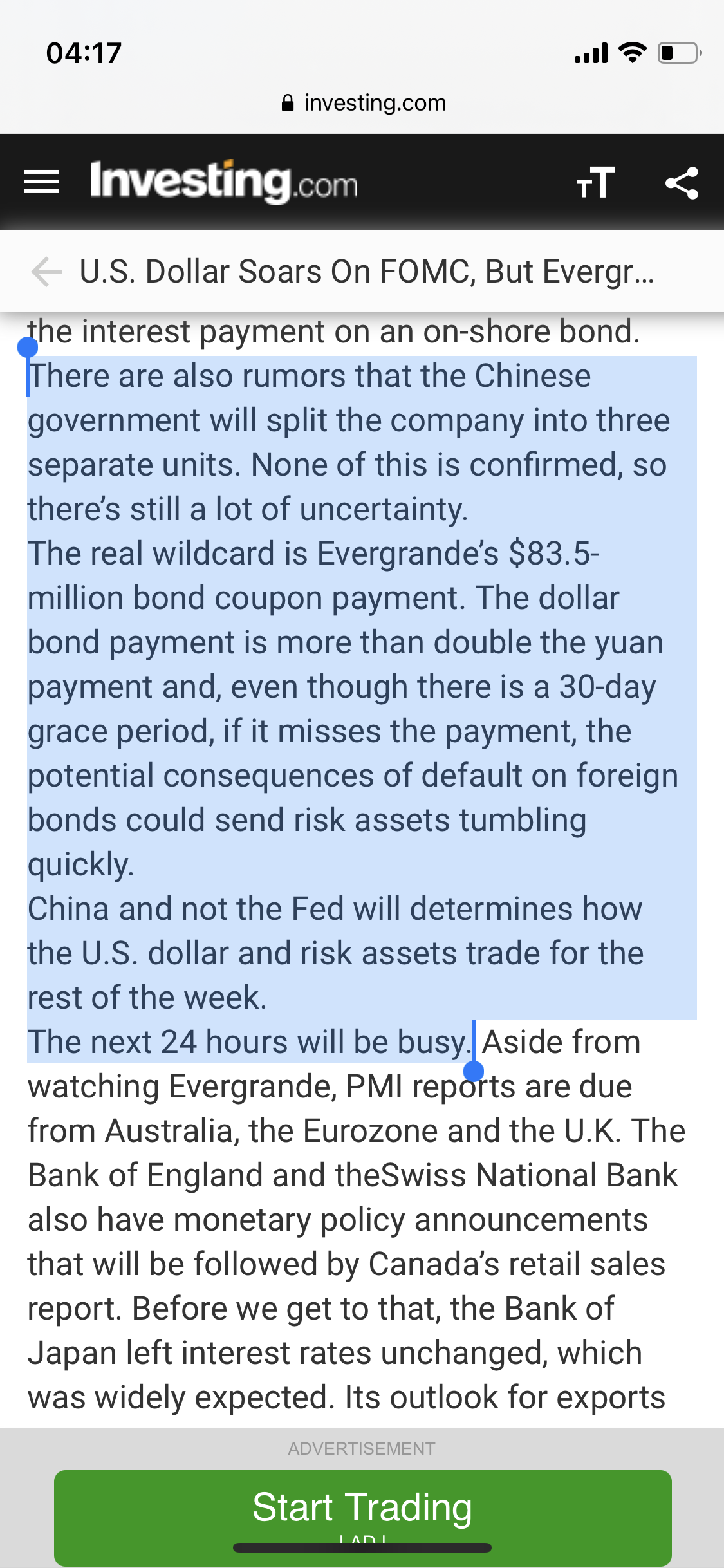 Evergrande vai ter um default, mas a gestão posterior vai ser organizada pelo Estado Chinês e pelas regiões Administrativas e bancos regionais. Um problema pouco significativo face ao problema real Chinês que é a desaceleração da economia (ainda afetado pela mega recessão COVID » a mais dramática na China pós 1982) - no último trimestre o PIB só cresceu 2,5% (nada para a China)