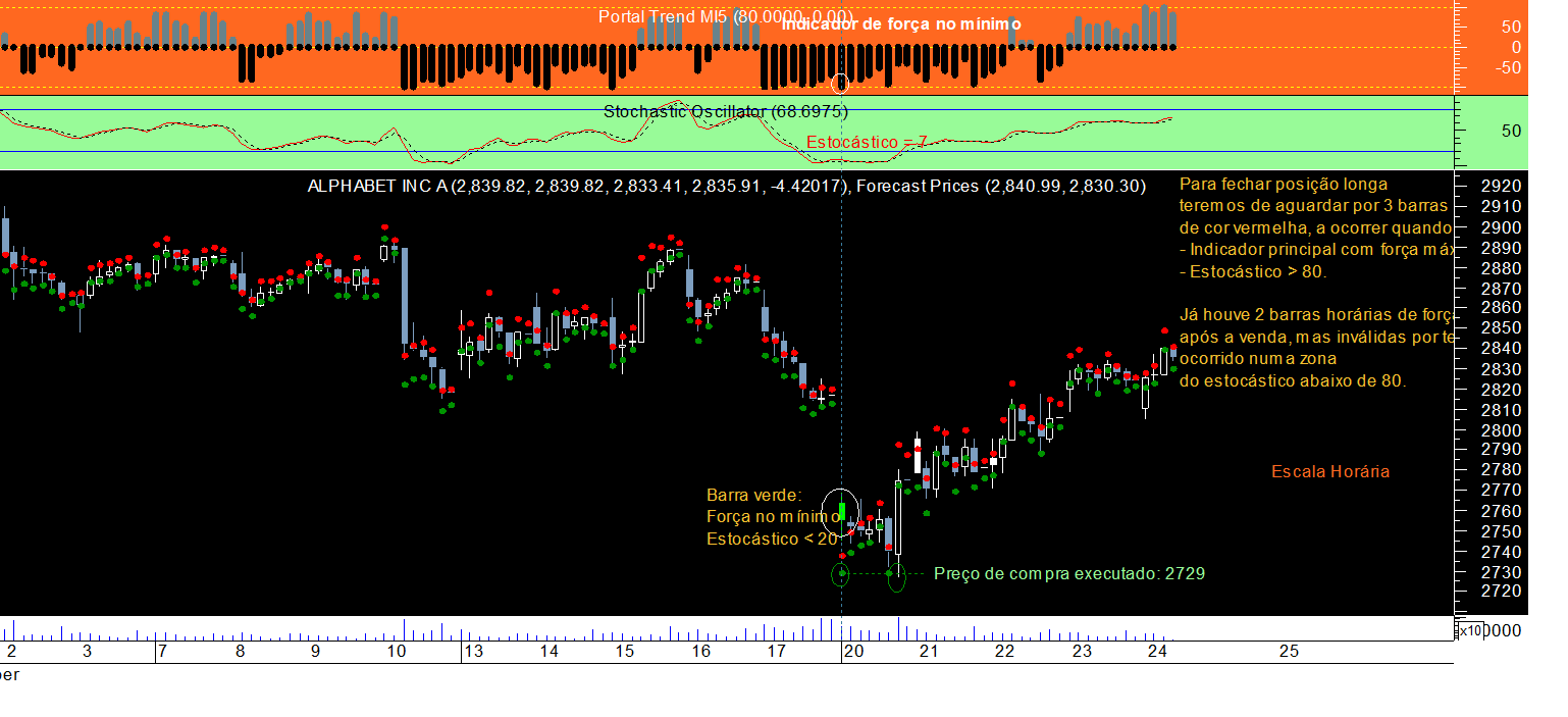 - Muito negativo na escala horária e positivo nas escalas semanal e diária. Para considerar que a escala horária esteja no “ponto certo” iremos deixar que apareça uma barra de cor “verde” na sua força mais negativa. Após s tal barra “verde” de força máxima negativa apontamos como preço de compra limite intraday o seu valor da compra, visualizado pelo ponto ou “dot” verde na zona baixa da referida barra.