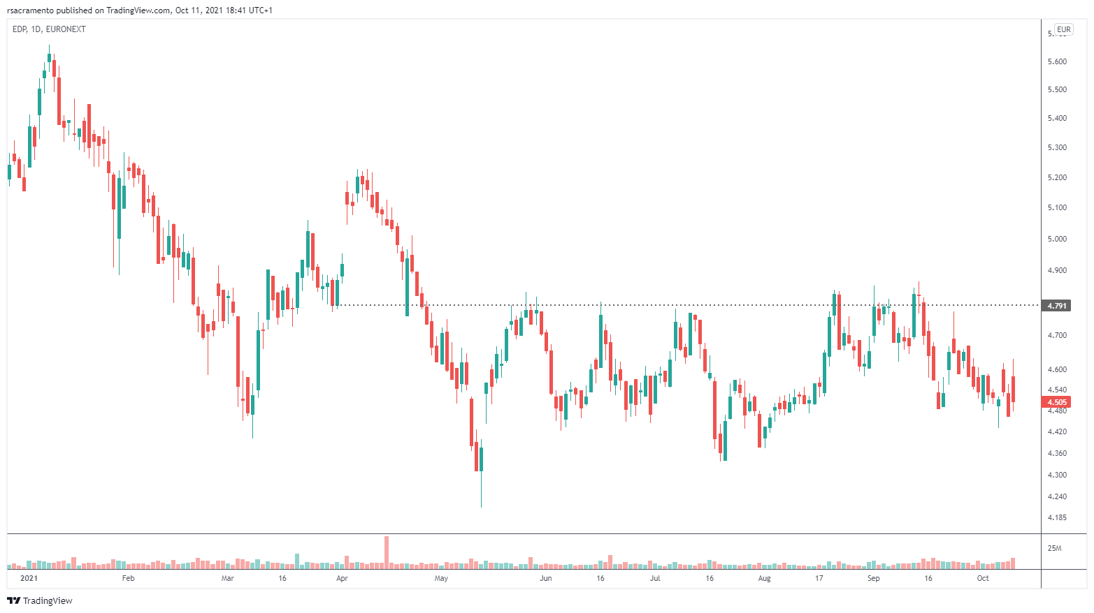 EDP está próximo de um suporte a 4.45€, e com dificuldade desde abril em ultrapassar a resistência a 4.8€.