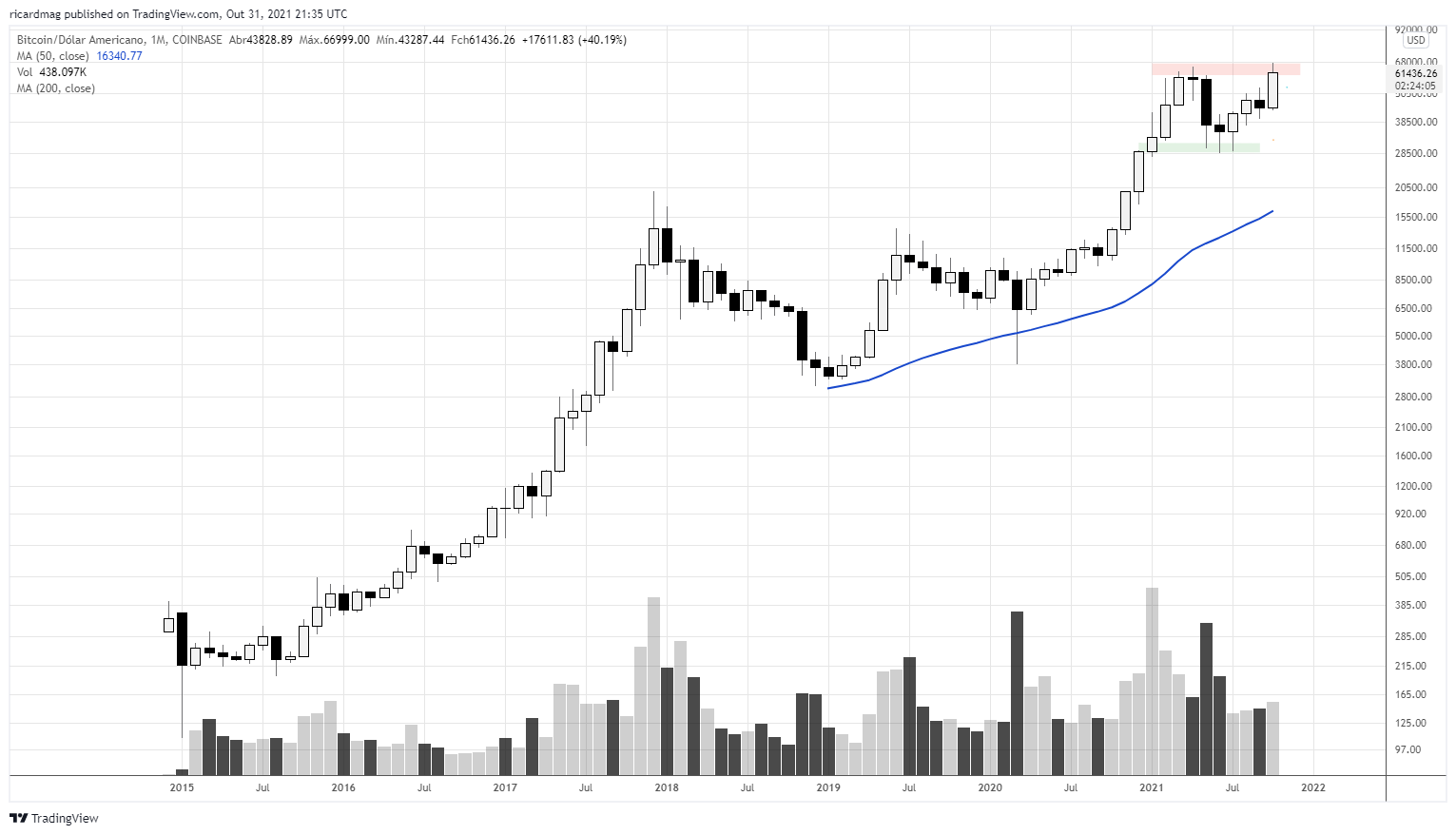 Se a bitcoin hoje fechar acima dos 58 800 $ tem o fecho mensal mais alto de sempre