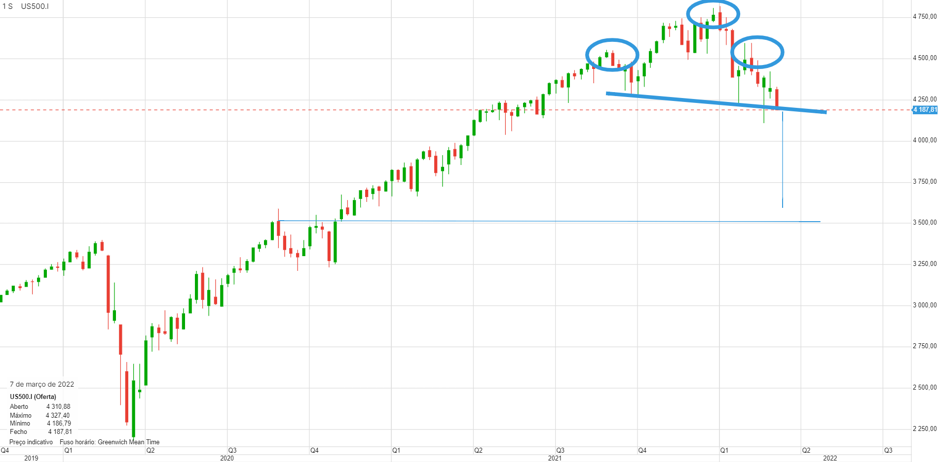 No cenário pessimista, a guerra prolonga-se, o oil e as restantes commodities mantém-se a níveis elevadíssimos e o mercado começa a não aguentar toda esta pressão e basicamente derrete.