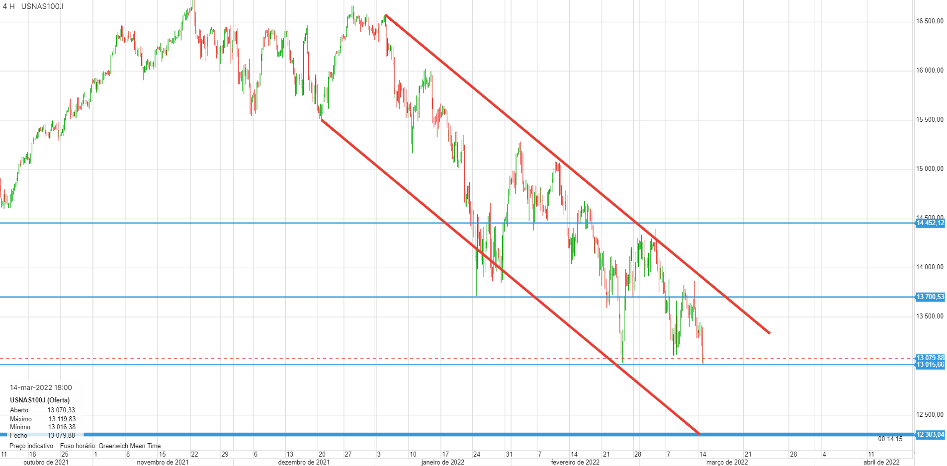 Este canal no gráfico de 4 horas tem-se revelado bastante certeiro. A caminho dos 13000 e provavelmente dos 12300.