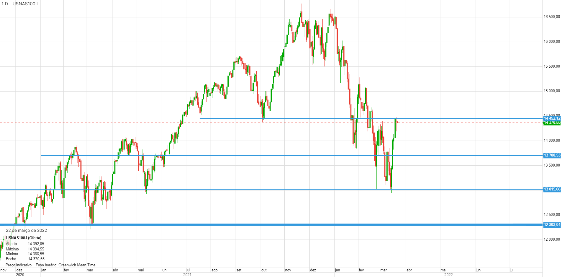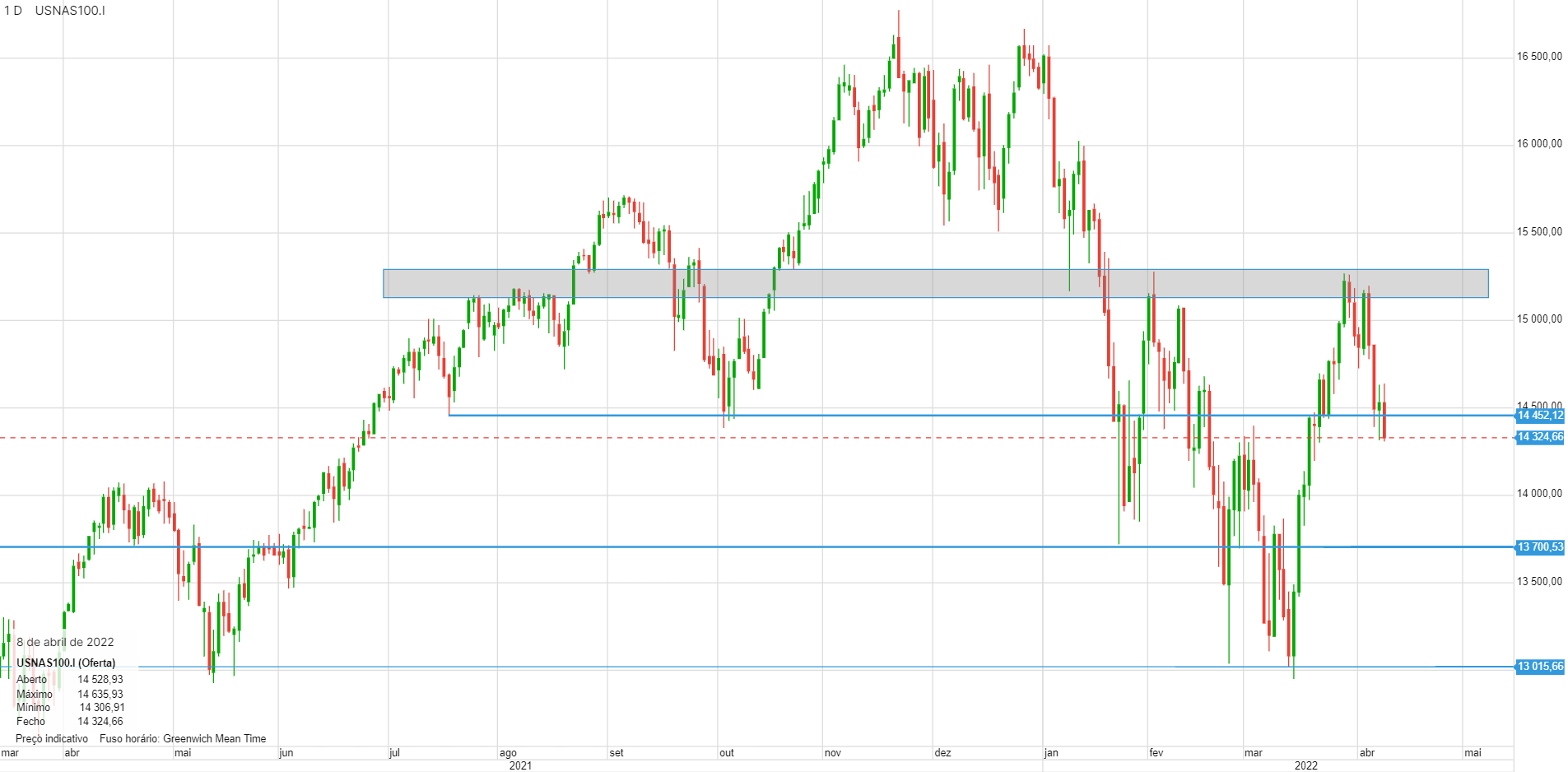 segunda tentativa falhada. no diário fez uma engulfing bearish. próxima paragem nos 14450.