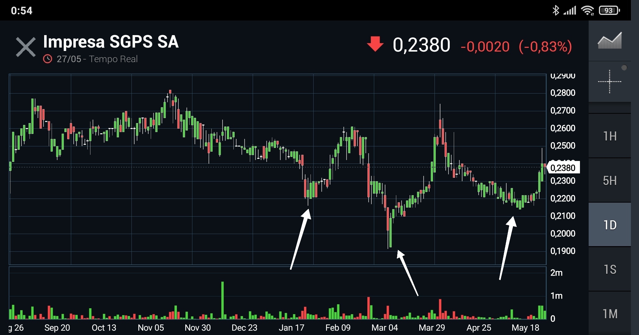 A verdade e que a cotacao nao vai par norte e desde julho de 2021 tem mantido a tendencia de queda , para que a mesma mude parece-me que precisa de uns fechos acima dos 0,26 ai acretido que va tocar de novo os 0,32 mas para ja a tendencia de queda mantem-se , veremos a proxima semana