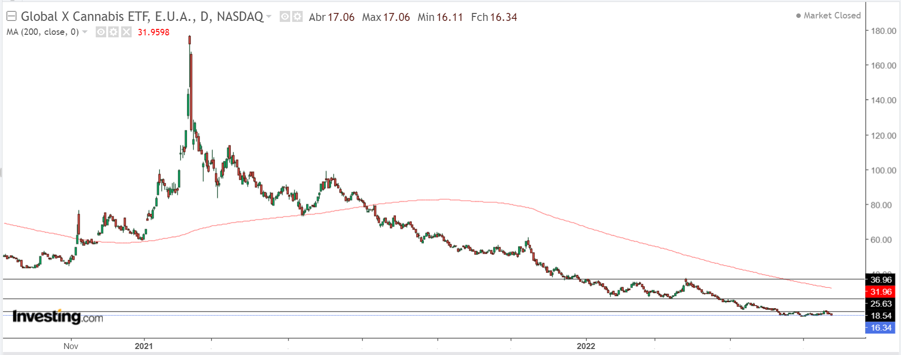 O que se verifica no sector cannabis até à data é um brutal "Bear Market", para já sem sinais de inversão e nem sequer no geral, a existência de rompimento de resistências no curto prazo...