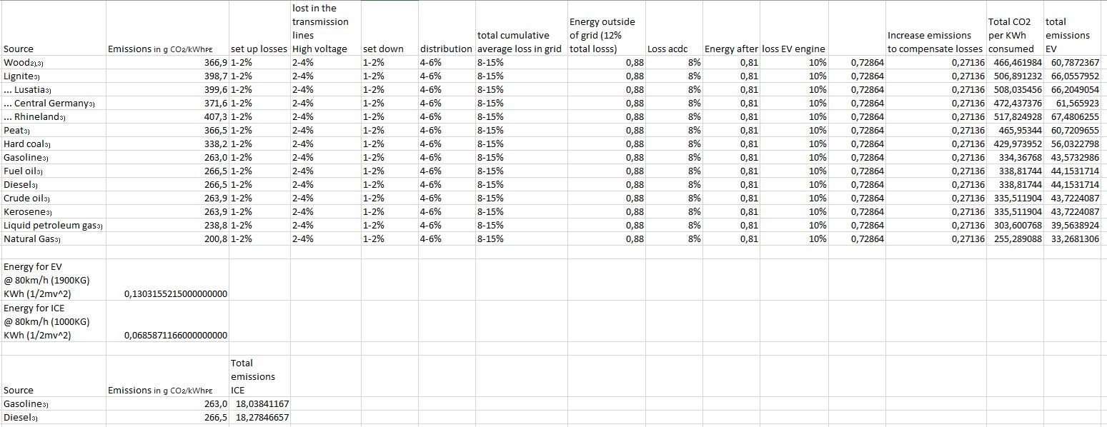E este excel que já colocaste duas vezes está claramente incompleto, eu não percebo bem o que é que se pretende mostrar ali. Qual é a fonte? O excel é teu? Se é teu continua incompleto. Se é de outra fonte, idem. Face ao original acrescentou uma estimativa das emissões por kWh de diferentes fontes mas continua com o problema original de saltar de uma formula física para a energia cinética do veículo (aparentemente a velocidade Cruzeiro) para o consumo (o que não é verdade nem para o eléctrico nem para o de combustão interna). Há um avanço, acrescentando mais alguns dados, mas o problema fundamental que eu já tinha apontado logo no primeiro post mantém-se.